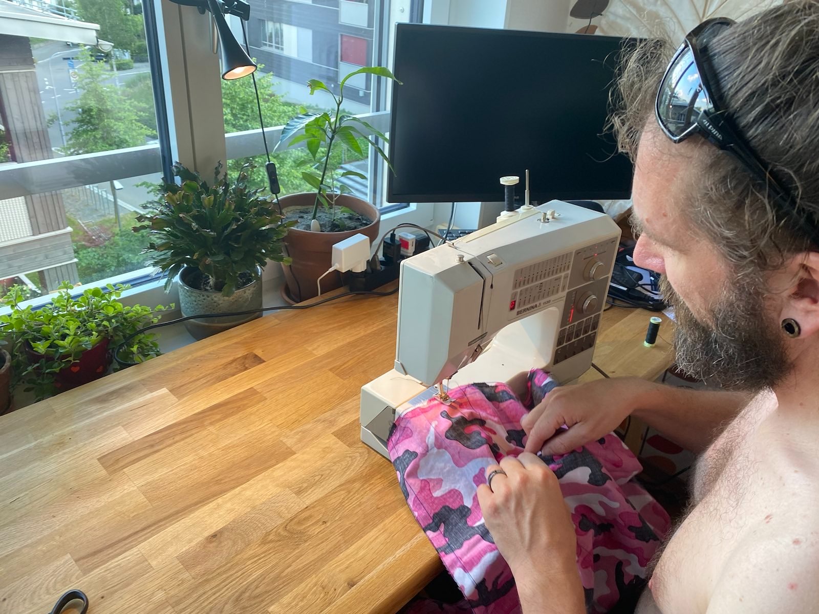 Me – after having read the f**king manual of my partners sewing maching: Sewing the very first prototype at our home (search for Tiger & Freak in google maps).